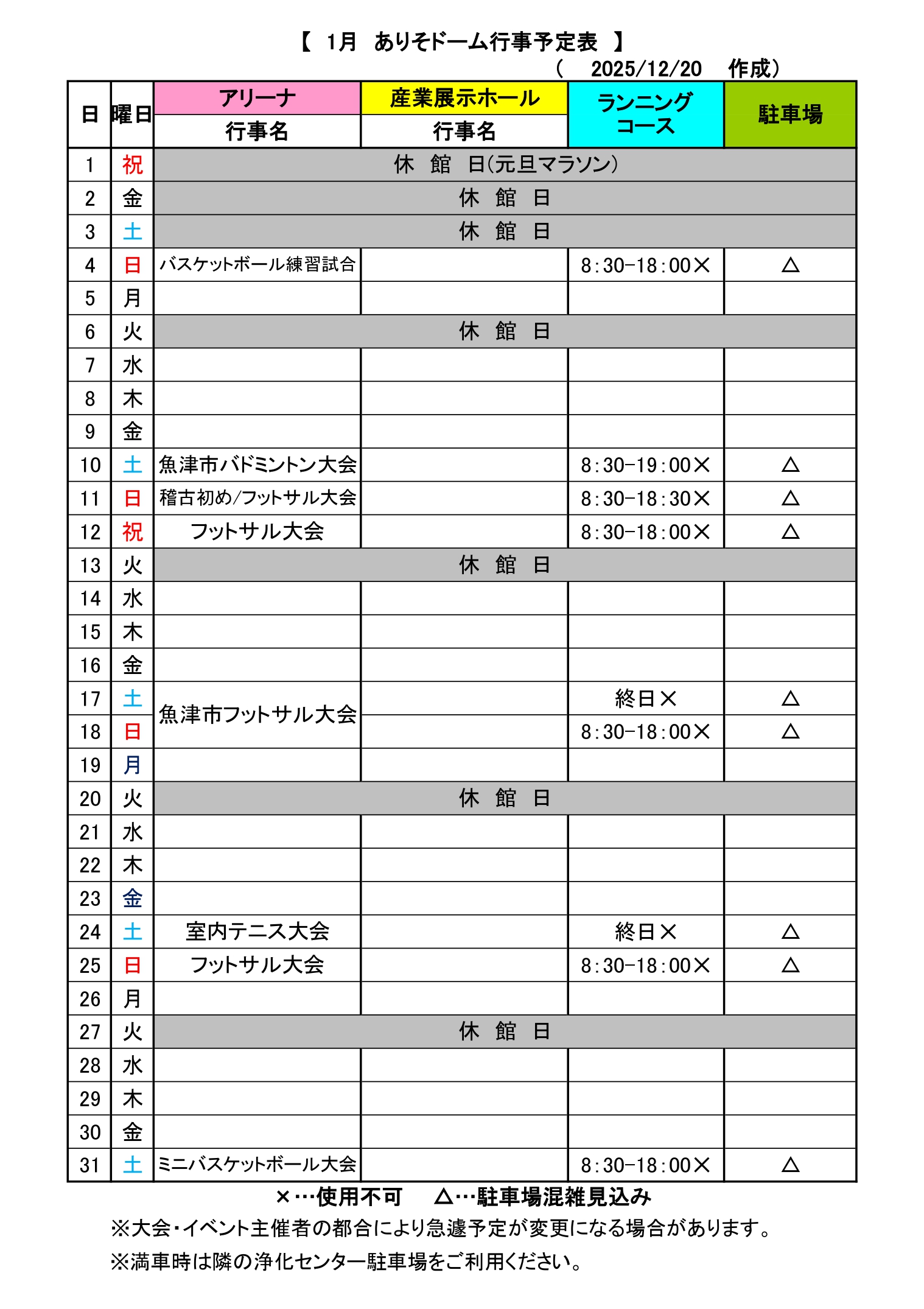 【1月の施設空き状況】 【注意】施設空き状況は、大会の進行状況等により当日でも変更になる可能性があります。予めご了承ください。 ★ アリーナ、産業展示ホール、研修室、主催者室、キッズベースの空き状況は こちら からご確認ください。 ★ ランニングコースの空き状況は、当館受付前の掲示板や行事予定表でご確認ください。 ★ 個人でのご利用はこちらからご確認ください。