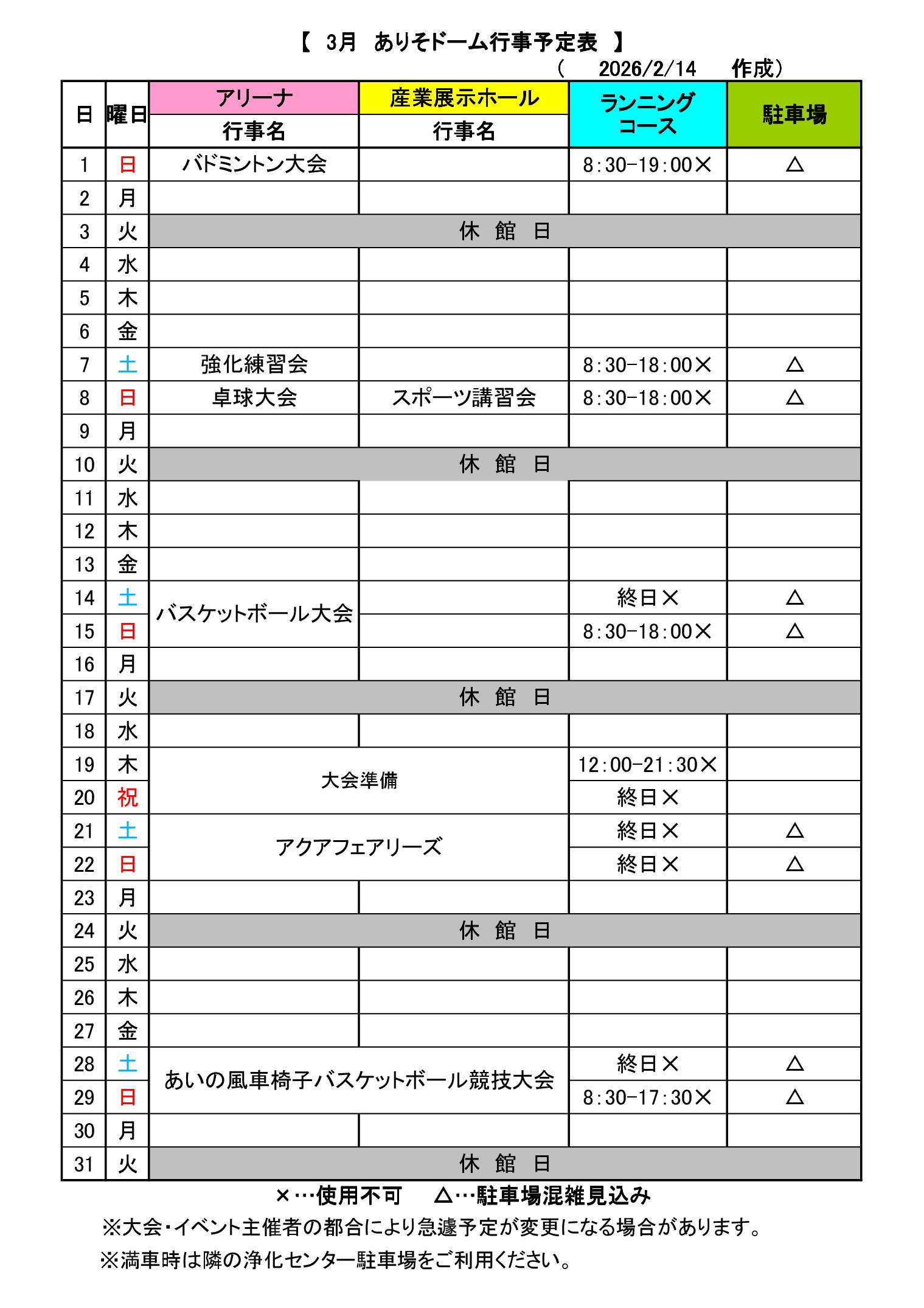 ★ アリーナ、産業展示ホール、研修室、主催者室、キッズベースの空き状況は こちら からご確認ください。