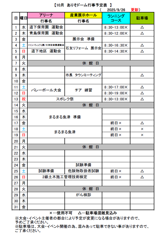 【10月の施設空き状況】 【注意】施設空き状況は、大会の進行状況等により当日でも変更になる可能性があります。予めご了承ください。 ★ アリーナ、産業展示ホール、研修室、主催者室、キッズベースの空き状況は こちら からご確認ください。 ★ ランニングコースの空き状況は、当館受付前の掲示板や行事予定表でご確認ください。 ★ 個人でのご利用はこちらからご確認ください。