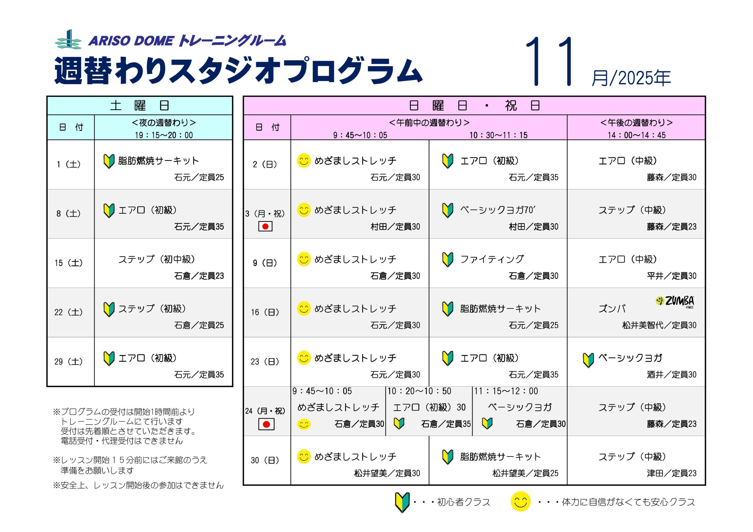 ・申込は先着順とし、各プログラム開始1時間前よりトレーニングルームで行います。お電話での受付や代理申込はできません。