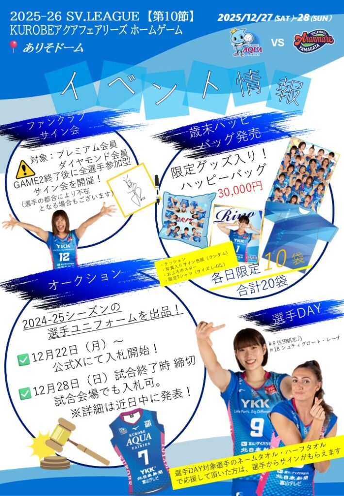 日程 2025/12/27(土)~2025/12/28(日) 時間 試合開始 14:05 場所 全館 お問い合わせ 一般社団法人 KUROBEアクアフェアリーズ TEL : 0765-57-3503 |